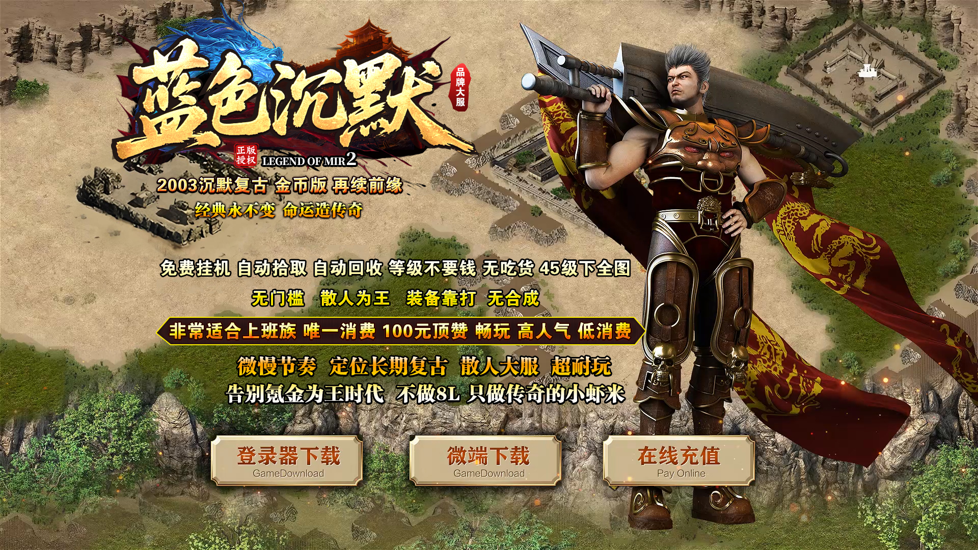 【版本特色】:本游戏所有装备靠打、级别可以手动升级和吃货升级、元宝装备保值、散人必选